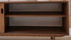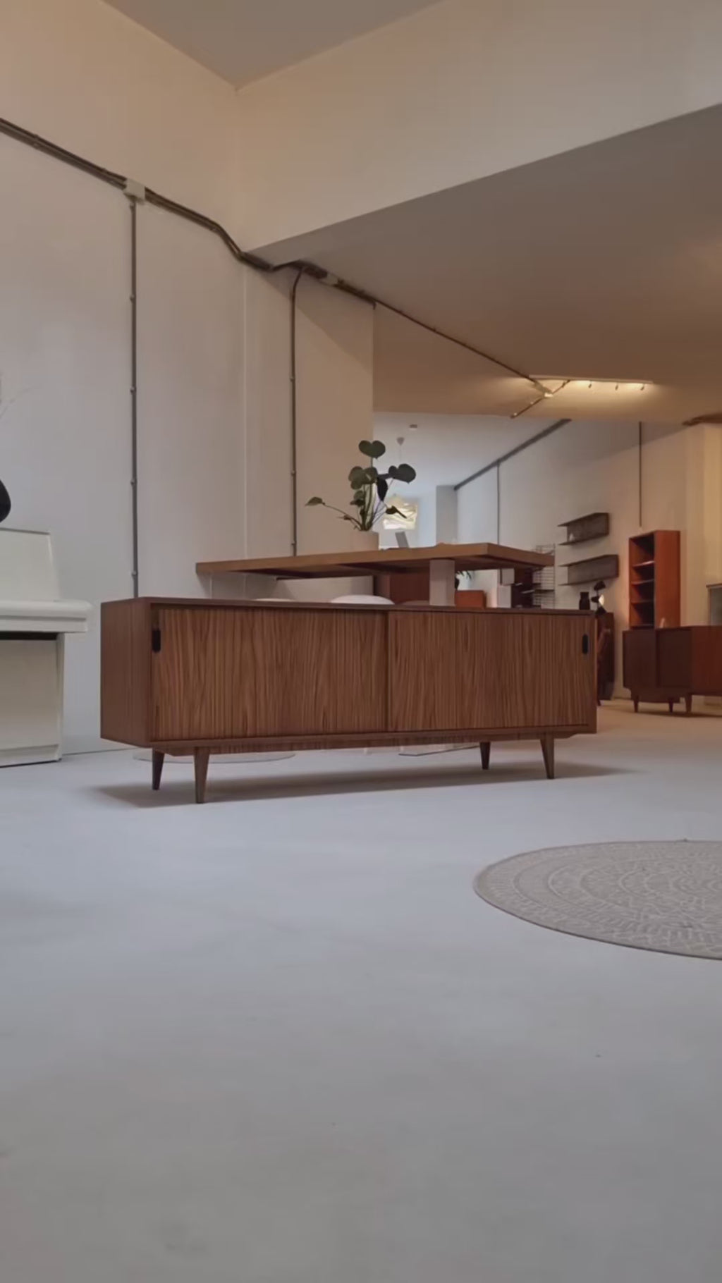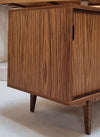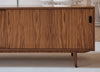 Dit stijlvolle sideboard ademt de natuurlijke, Scandinavische sfeer van de jaren zeventig. Het strakke design en het warme walnootfineer geven het meubel een tijdloze uitstraling. De taps toelopende houten poten zorgen voor elegantie, terwijl de zwarte grepen een stoer accent toevoegen.