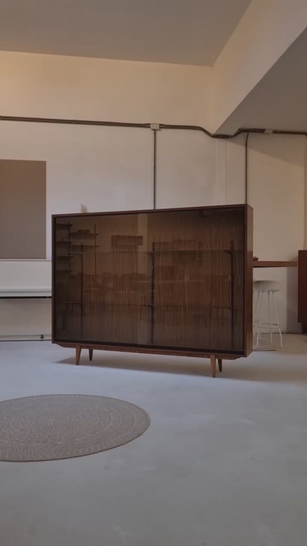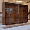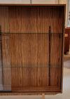Achter de twee grote glazen schuifdeuren bevinden zich twee in hoogte verstelbare planken, ideaal voor het tentoonstellen van servies, boeken of verzamelobjecten.