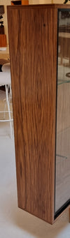 Prachtige vintage vitrinekast uit de jaren zeventig met een tijdloze Scandinavische uitstraling. De kast is strak vormgegeven en vervaardigd uit walnootfineer, wat zorgt voor een warme en natuurlijke look. De taps toelopende houten poten geven het meubel een elegante lift en een verfijnde retro-uitstraling.
