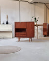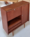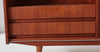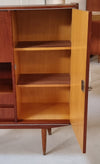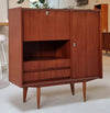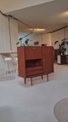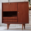 Prachtige kast uit de sixties met een Scandinavische uitstraling, uitgevoerd in hoogwaardig teakfineer. Het strakke design en de elegante taps toelopende houten poten geven dit meubel een tijdloos karakter.