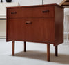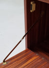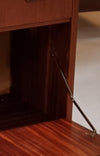 De kast is voorzien van twee lades aan de bovenzijde en een klep daaronder, waardoor het meubel zowel praktisch als stijlvol is. De bijzonder mooi vormgegeven houten grepen en de ronde conische poten geven de kast een verfijnd en elegant karakter.