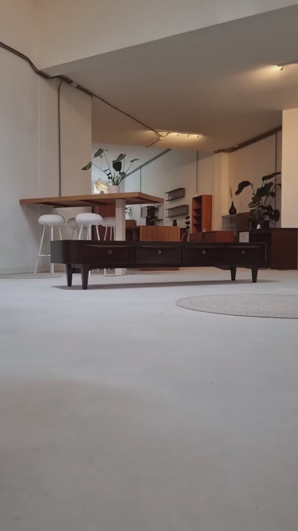 Dit stijlvolle lowboard uit de jaren zestig ademt pure Scandinavische elegantie. Het strakke design, gecombineerd met hoogwaardig donker walnootfineer, zorgt voor een warme en natuurlijke uitstraling.