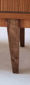 Dit stijlvolle lowboard ademt de elegante eenvoud van Scandinavisch design. Het strak vormgegeven silhouet, uitgevoerd in hoogwaardig teakfineer, geeft het meubel een warme en natuurlijke uitstraling. De taps toelopende houten poten zorgen voor een verfijnde, luchtige look, terwijl het metalen greepje een subtiel stoer accent toevoegt.