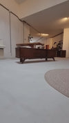 Dit stijlvolle lowboard ademt de natuurlijke Scandinavische sfeer van de jaren ’60. Het strakke design in combinatie met het hoogwaardig donker notenfineer geeft het meubel een tijdloze uitstraling. De taps toelopende houten poten zorgen voor een elegante, luchtige look.