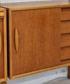 De rechter kast heeft links een schuifdeur met daarachter een plank en rechts vier lades, ideaal voor het opbergen van kleinere items.