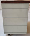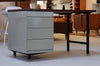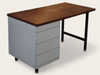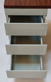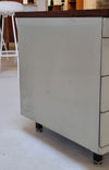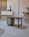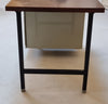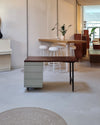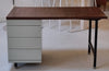 Magnifique bureau au look industriel et minimaliste. Le caisson à tiroirs en métal gris à quatre tiroirs et le cadre en métal noir confèrent au meuble un caractère robuste. Le plateau est en placage d'aspect palissandre, ce qui lui confère un aspect chaleureux et élégant.