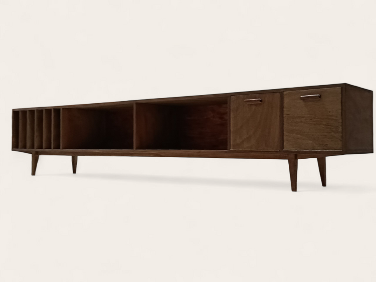 Il design offre un ampio spazio di archiviazione: sei scomparti verticali per la tua collezione in vinile o libri, due scomparti aperti nel mezzo e due valvole a destra per un tutto in ordine.