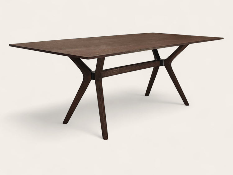 Il tavolo da pranzo Kajse è artigianato con carattere. Un bellissimo mobile fatto a mano dal nostro produttore di mobili Løkie a Rotterdam. Con le sue linee pulite e il caldo teak marrone Wengé, questo tavolo respira un'atmosfera scandinava raffinata. La scultura in legno sottile e progettata nel telaio aggiunge un carattere unico e solleva il design a un livello superiore. Le quattro gambe robuste sono collegate tra loro tramite una barra intermedia e due eleganti blocchi di metallo nero.
