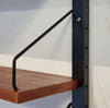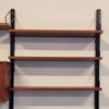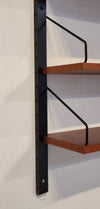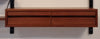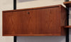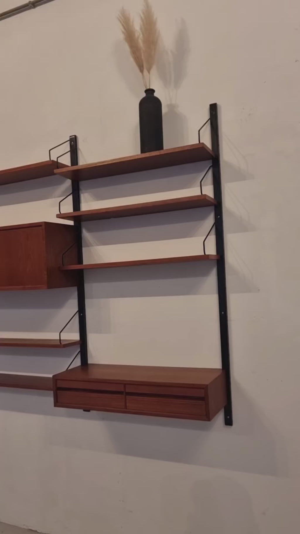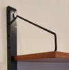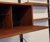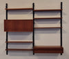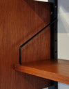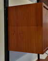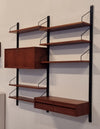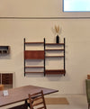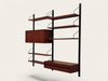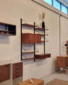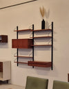 Dit elegante wandsysteem is ontworpen door de Deense ontwerper Poul Cadovius. Het geheel heeft een natuurlijke Scandinavische uitstraling dankzij het strakke, functionele design en het gebruik van hoogwaardig teakfineer. De zwarte metalen frames en plankenhouders geven het systeem een stoer, modern accent. Het wandsysteem beschikt over een afsluitbare klepkast met in de kast een kleine glazen plank. Tevens is er een klein ladeblok met twee lades. Alle elementen en planken zijn naar eigen wens hoger, lager of zijwaarts te plaatsen.