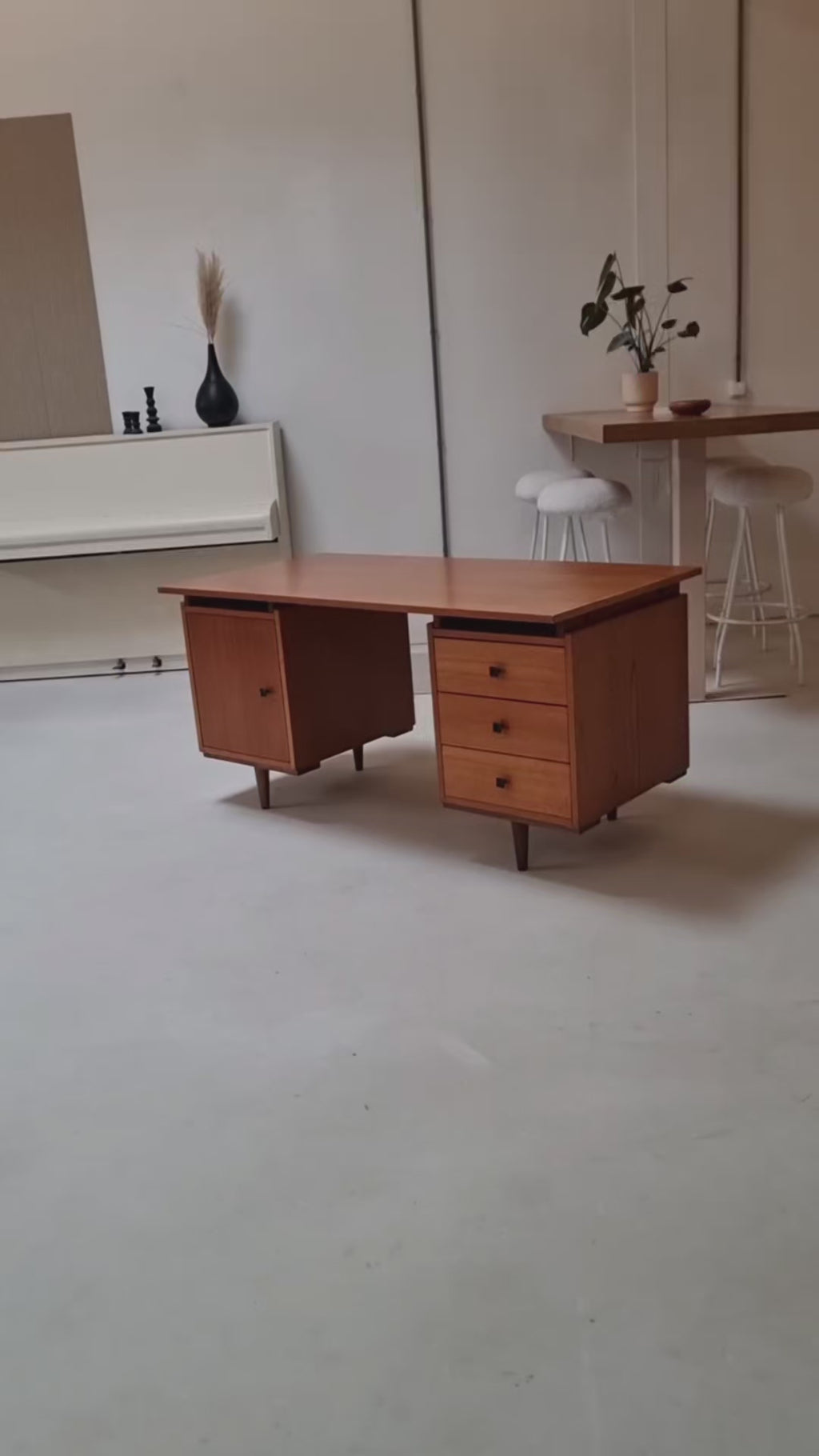 Stijlvol vintage bureau met een natuurlijke Scandinavische uitstraling, kenmerkend voor het strakke design en het gebruik van hoogwaardig teakfineer. De ronde, conische houten poten geven het meubel een elegante uitstraling, terwijl de zwarte metalen knoppen zorgen voor een subtiel stoer accent.