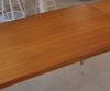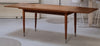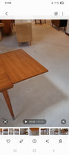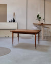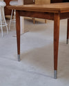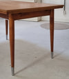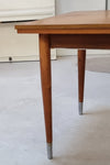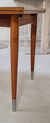 Prachtige Mid-Century vintage eettafel uit de jaren zestig. De tafel heeft een natuurlijke Scandinavische uitstraling dankzij het strak vormgegeven design en het gebruik van hoogwaardig teakfineer. De ronde, conische houten poten geven de tafel extra elegantie, terwijl de tinnen voetjes voor een subtiel stoer accent zorgen.