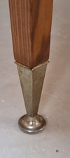 Prachtige Mid-Century vintage eettafel uit de jaren ’60, uitgevoerd in hoogwaardig teakfineer. Het strakke, tijdloze ontwerp geeft de tafel een warme Scandinavische uitstraling. De vierkante, conisch gevormde houten poten zijn verfijnd afgewerkt met elegante ijzeren voeten, wat de tafel extra karakter en klasse geeft.