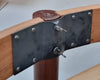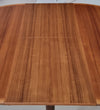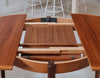 De tafel is uitschuifbaar: door de twee hoofdbladen uiteen te trekken komt een discreet geïntegreerd verlengblad tevoorschijn. Dit verlengblad kan eenvoudig tussen de hoofdbladen worden geplaatst, waardoor een royale tafel ontstaat — ideaal voor diners of extra gasten. De poten zijn bovendien demontabel met vleugelmoeren, wat transport en verplaatsing gemakkelijk maakt.