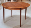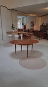 Deze elegante eettafel uit de jaren zestig ademt pure Scandinavische stijl. Het strakke design in hoogwaardig teakfineer wordt prachtig gecombineerd met ronde, conische houten poten, wat de tafel een verfijnde en minimalistische uitstraling geeft.