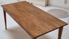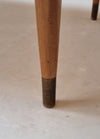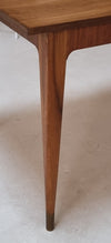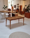 Deze stijlvolle vintage eettafel uit de jaren zestig straalt de kenmerkende Scandinavische elegantie uit: strak vormgegeven lijnen, warme houttinten en subtiele details. De tafel is vervaardigd uit hoogwaardig notenfineer en rust op prachtig vormgegeven rond conische houten poten met een lichte welving aan de bovenzijde. De messing doppen aan de onderzijde geven het geheel een verfijnde, luxe uitstraling.