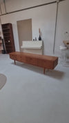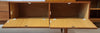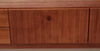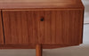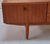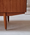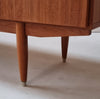 Prachtig Mid Century modern vintage lowboard uit de jaren zestig, uitgevoerd in hoogwaardig teakfineer. Het meubel heeft een karakteristieke Scandinavische uitstraling dankzij het strakke, tijdloze ontwerp en de warme houttint. De ronde, conische houten poten geven het lowboard een elegant en luchtig karakter. De donkerhouten conische kastknoppen vormen een versterken de authentieke uitstraling.