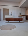 Het lowboard is praktisch ingedeeld met drie kleppen en twee lades, ideaal voor het opbergen van servies, media of andere spullen.