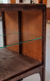 De kast heeft twee glazen deuren met daarachter een glazen legplank, ideaal voor het tentoonstellen van servies, glaswerk of verzamelobjecten. De achterwand van spiegelglas zorgt voor extra diepte en een elegante lichtreflectie.